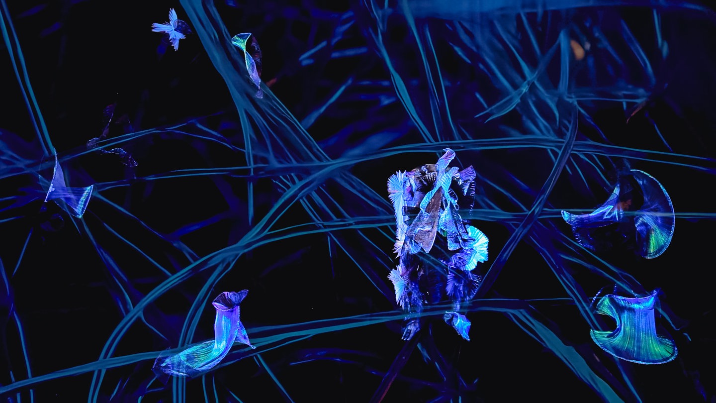 neonfarben (türkis, lila, pink, silber, schwarz, weiß), extrem nah, neue Welt, andere Welt, verträumt, bedrohlich, suchend, flatternd, brodelnd, klebrig, zäh, Pixel, Artefakte, Glitches, Morphing, Unschärfe, Zwischending aus Organismus und Maschine, Eigenleben, Wesen zwischen Realität und Virtualität, Täuschung, Tentakel, Follikel, Flossen, Fächer, Gallert, Ursuppe, Aggregatzustände und fließende Übergänge