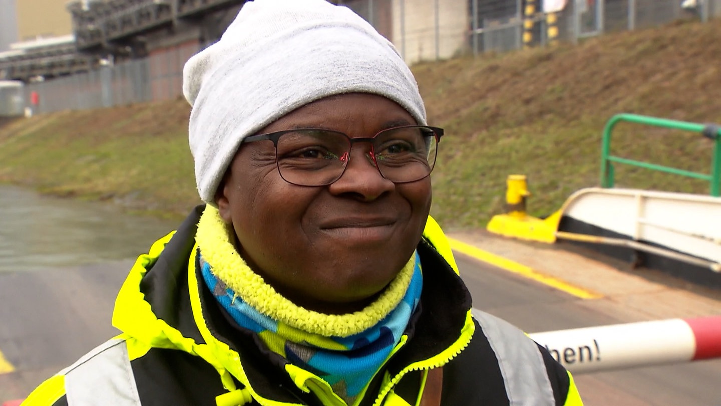 Chucky lebt seit 18 Jahren in Altrip. Genauso lange arbeitet er bei einer Spedition, bis er sich entschließt, etwas in seinem Leben zu verändern: Im Februar 2023 fängt der gebürtige Nigerianer einen neuen Job an und wird Decksmann auf der Rheinfähre zwischen Altrip und Mannheim. Die bringt vor allem Pendlerinnen und Pendler über den Fluss. Vom Großkraftwerk auf der Mannheimer Seite geht es in zwei Minuten rüber nach Altrip – und dabei ganz fließend von Baden-Württemberg nach Rheinland-Pfalz.