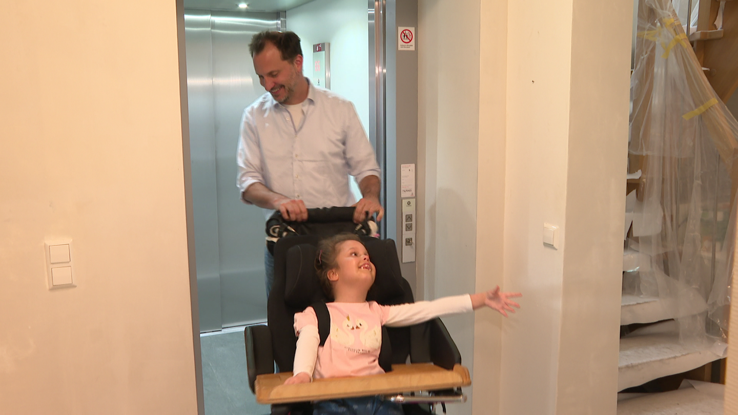 Insgesamt kommen knapp 100.000€ plus etwa 70.000€ Stiftungsgelder zusammen. Vor einem Jahr kann der aufwändige und teure Bau beginnen, vor Kurzem kann Frieda den Lift zum ersten Mal benutzen. Ein neuer und unbeschwerlicherer Alltag beginnt für die ganze Familie, erzählt Jutta gerührt: „Das kann man gar nicht in Worte fassen. Dass tatsächlich nach dieser langen Zeit der Aufzug endlich fertig ist, das ist unbeschreiblich schön. Wenn man das tägliche Hoch- und Runtertragen, diese Last nicht mehr verspürt – die Erleichterung ist riesengroß.“