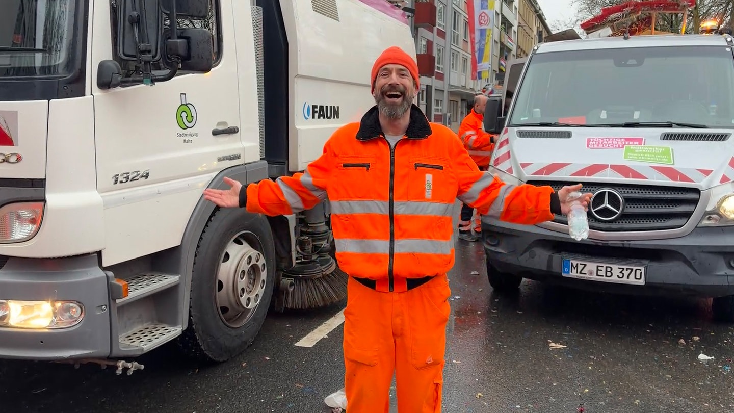 Beim Mainzer Rosenmontagszug 2026 fahren über 100 Wagen. Der letzte ist traditionell die Zugente, also das Zugende. Dann geht für das Team der Mainzer Stadtreinigung die Arbeit so richtig los. Nur wenige Sekunden nach der Ente stürmen die Stadtreiniger mit Laubbläsern, Besen und Schaufeln die Straßen. „Ich hätte nicht gedacht, dass die so schnell direkt hinter dem Zug loslegen, richtig krass“, findet Luisa, die mit ihrer Freundin Laura den Rosenmontagszug angesehen hat.