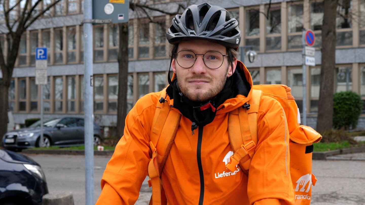 Lukas ist Student und arbeitet nebenbei seit zweieinhalb Jahren als Fahrradkurier bei Lieferando in der Stuttgarter Innenstadt: „Ich habe Fahrer und Fahrerinnen auf der Straße gesehen und dachte mir: Das könnte ich eigentlich auch machen. Mich ein bisschen bewegen, Rad fahren, Geld verdienen – das hat sich als Nebenjob ganz gut angeboten.“