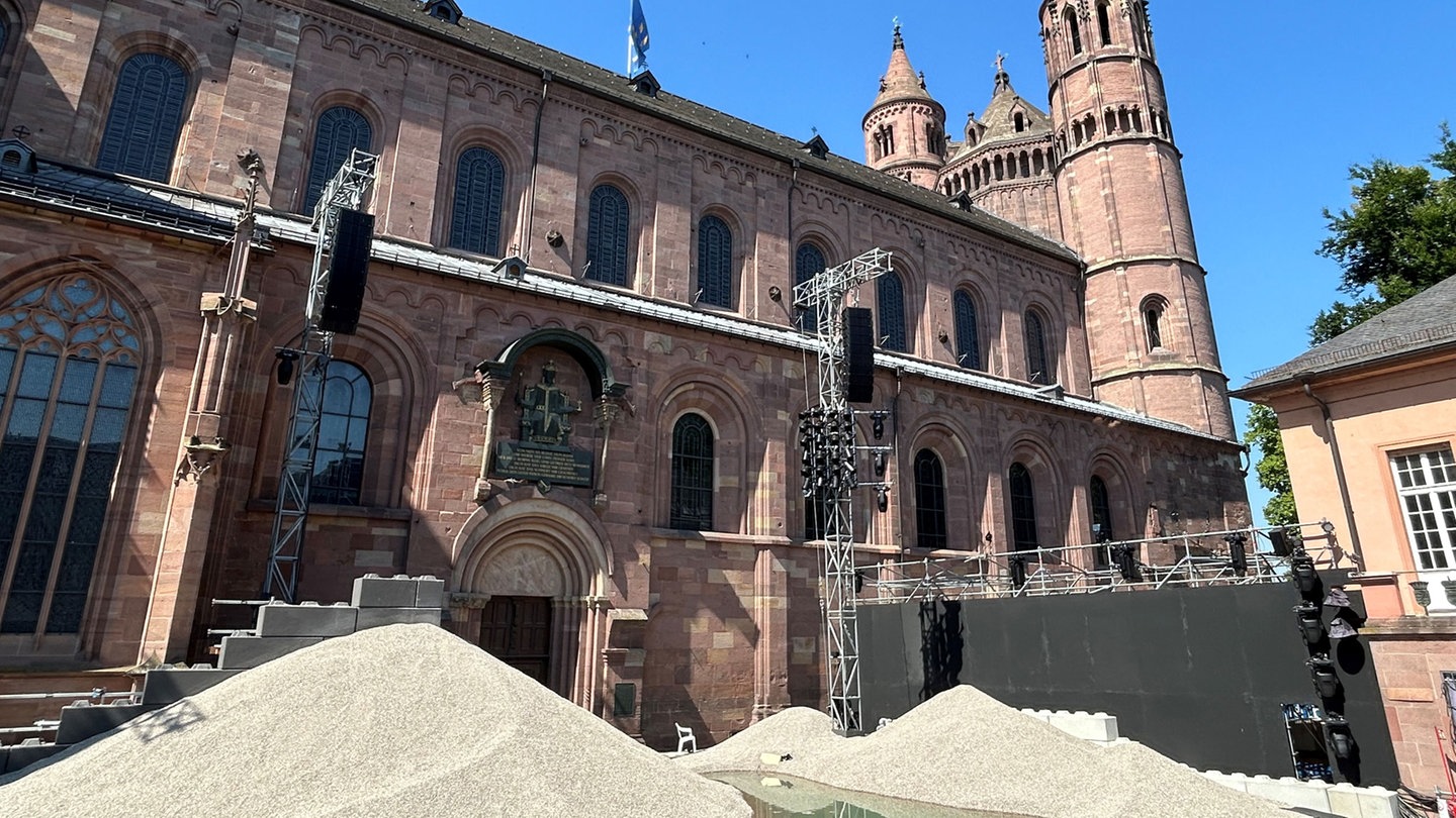 Im Stück „See aus Asche“ von Roland Schimmelpfennig spielt der Schatz der Erde – das Rheingold – eine zentrale Rolle. Regisseurin Mina Salehpour und ihr künstlerisches Team haben für diesen Schatz eine steinige Übersetzung gefunden: Die Bühne vor dem Wormser Dom wird komplett mit Kies aus dem Rhein bedeckt.