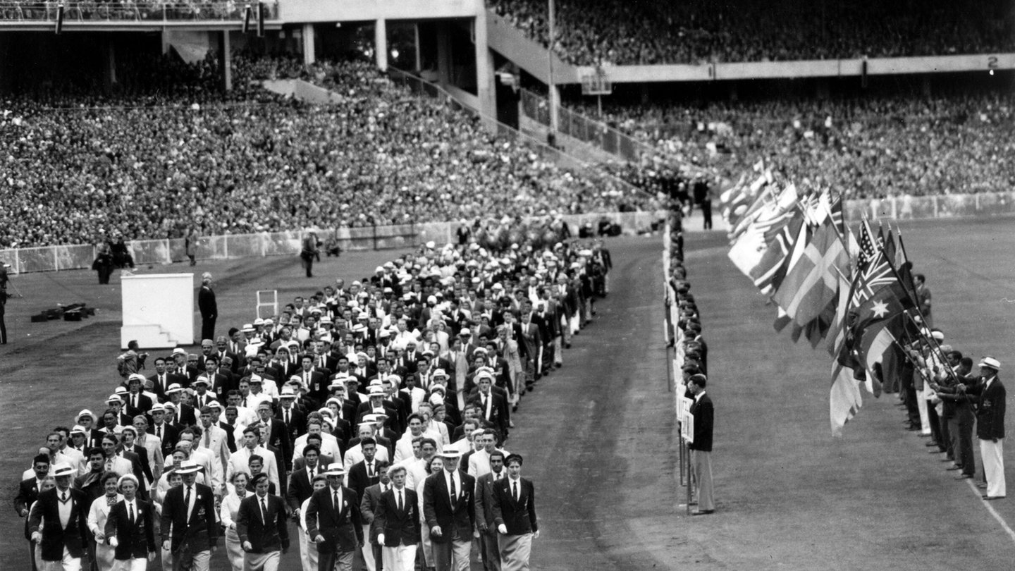 Olympische Spiele in Australien 1956. Reitwettkämpfe in Stockholm. Eine Nationalhyme für zwei deutsche Mannschaften, blutige Wasserspiele, dies sind die Besonderheiten der Spiele.