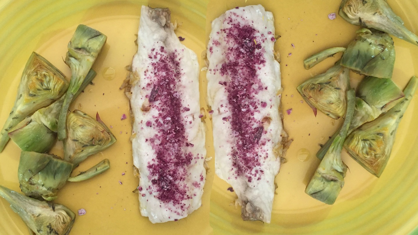 Gebratene Fische und Artischocken auf Tellern anrichten und die Fische mit dem Zwiebelsalz bestreuen.