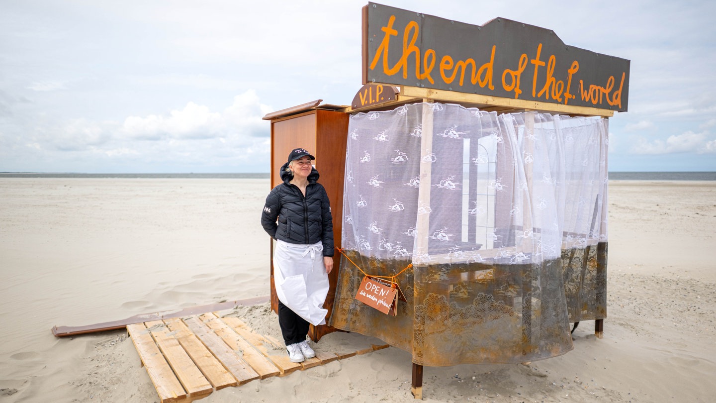 Und wo könnte man besser über dieses Gefühl sprechen als in einer Kneipe? Der Name von Constanze Klars Kneipe auf Spiekeroog: „At the end of the f. World“. Also die Kneipe zum Ende der nun ja: verdammten Welt. Fast eine Woche lang stand sie auf dem breiten Strand von Spiekeroog, zu trinken gab es Bier aus der Region.