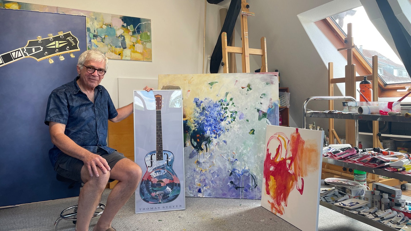 Dort hat ihn Sandra Helmeke besucht und sich erzählen lassen, was ihn zu seinen abstrakten Acryl- und Ölgemälden inspiriert und was ihn an reflektierenden, realistischen Oberflächen reizt. Und, wie es dem Kunststudenten in den 80ern gelang, an die Gitarre von Mark Knopfler zu kommen und das Plattencover eines der meistverkauften Rockalben der Musikgeschichte mitzugestalten.