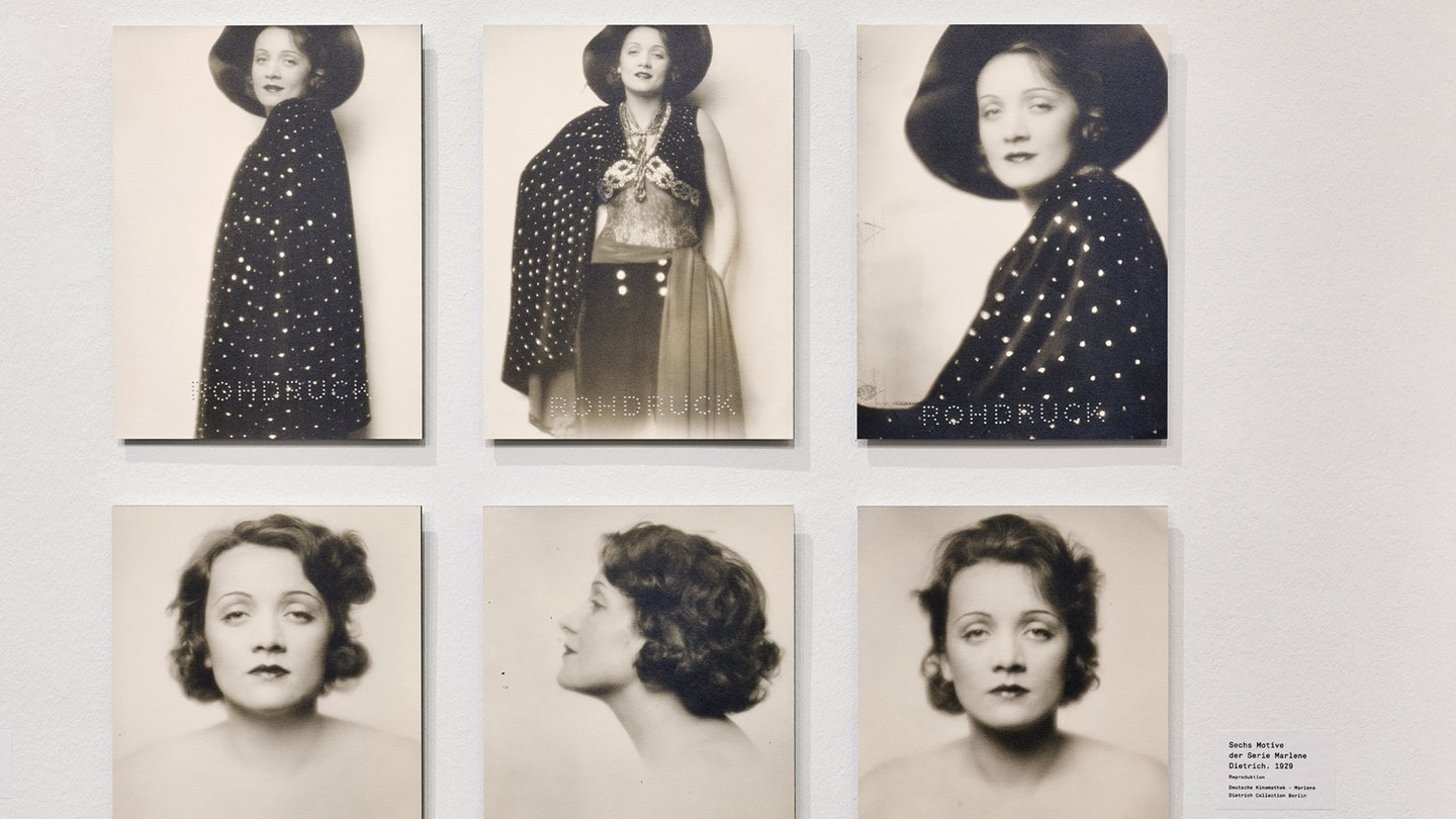 „Wir sehen sechs Fotos. Oben ist sie im Kostüm aus ‚Der blaue Engel‘, unten sehen wir das Porträt bis zu den Schultern“, erklärt Kuratorin Manuela Husemann. „Man sieht also wirklich nur ihr Gesicht. Die Konzentration liegt auf den Augen, auf diesem Schlafzimmerblick, für den sie ja auch so berühmt geworden ist. Es sind ganz spannende Fotos, die eben Marlene Dietrich ‚pur‘ zeigen.“