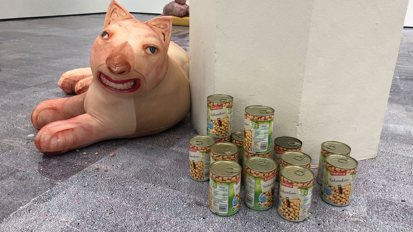 Was ist denn hier passiert? Im Projektraum der Städtischen Galerie Karlsruhe liegen wild aufeinander geworfen dutzende von Schaumstoffmatratzen. Obendrauf, untendrunter und daneben sitzen oder liegen seltsame, überlebensgroße Katzen-Wesen.