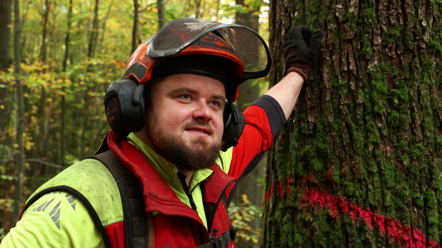Im schwäbisch-fränkischen Wald fühlt sich Mario Walz zu Hause. Er ist Holzarbeiter aus Leidenschaft und arbeitet täglich mit der Kettensäge.