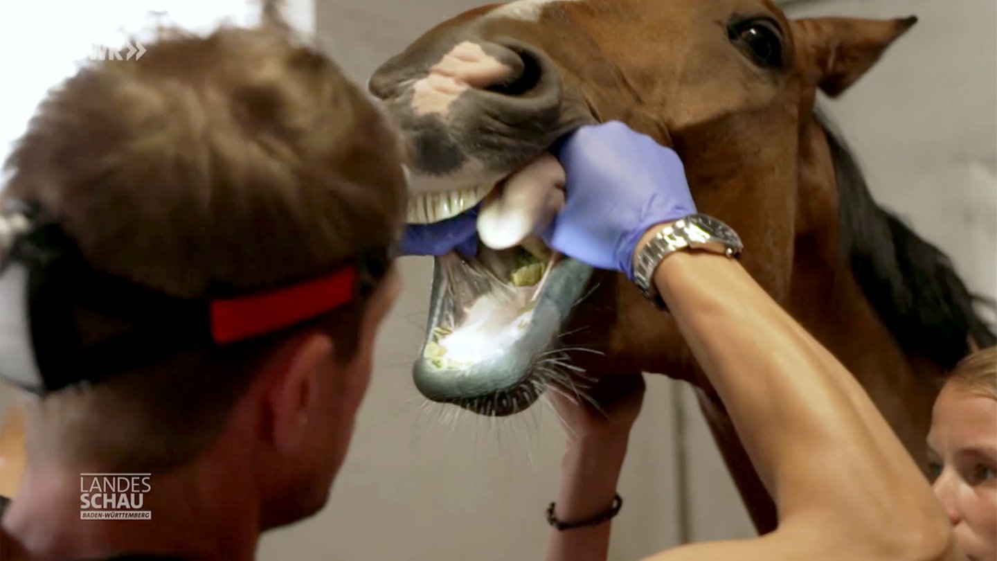 Christian Schreitmüller ist als mobiler Tierarzt unterwegs. Denn die Pferdeklinik in Kirchheim versorgt die Pferde auch vor Ort im Stall. Heute kommt ein Schleifer in XXL-Format zum Einsatz.