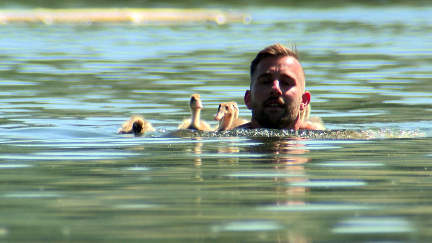 Sie sind einfach zuckersüß – die drei Wochen alten Laufentenküken zusammen mit ihrem „Ziehpapa“ Patrick Furch. Gemeinsam ziehen sie ihre Runden im Breitenauer See. Für die Küken das pure Vergnügen.