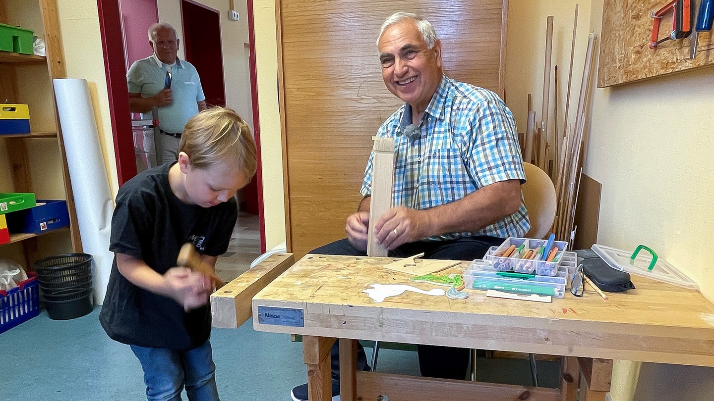 In Bornich bereichern Rentner den Kita-Alltag. Dietmar Dommershausen und Fred Flackus sind Handwerkspaten der Initiative "55 plus-minus" und hämmern, sägen, basteln zusammen mit den Kindern.