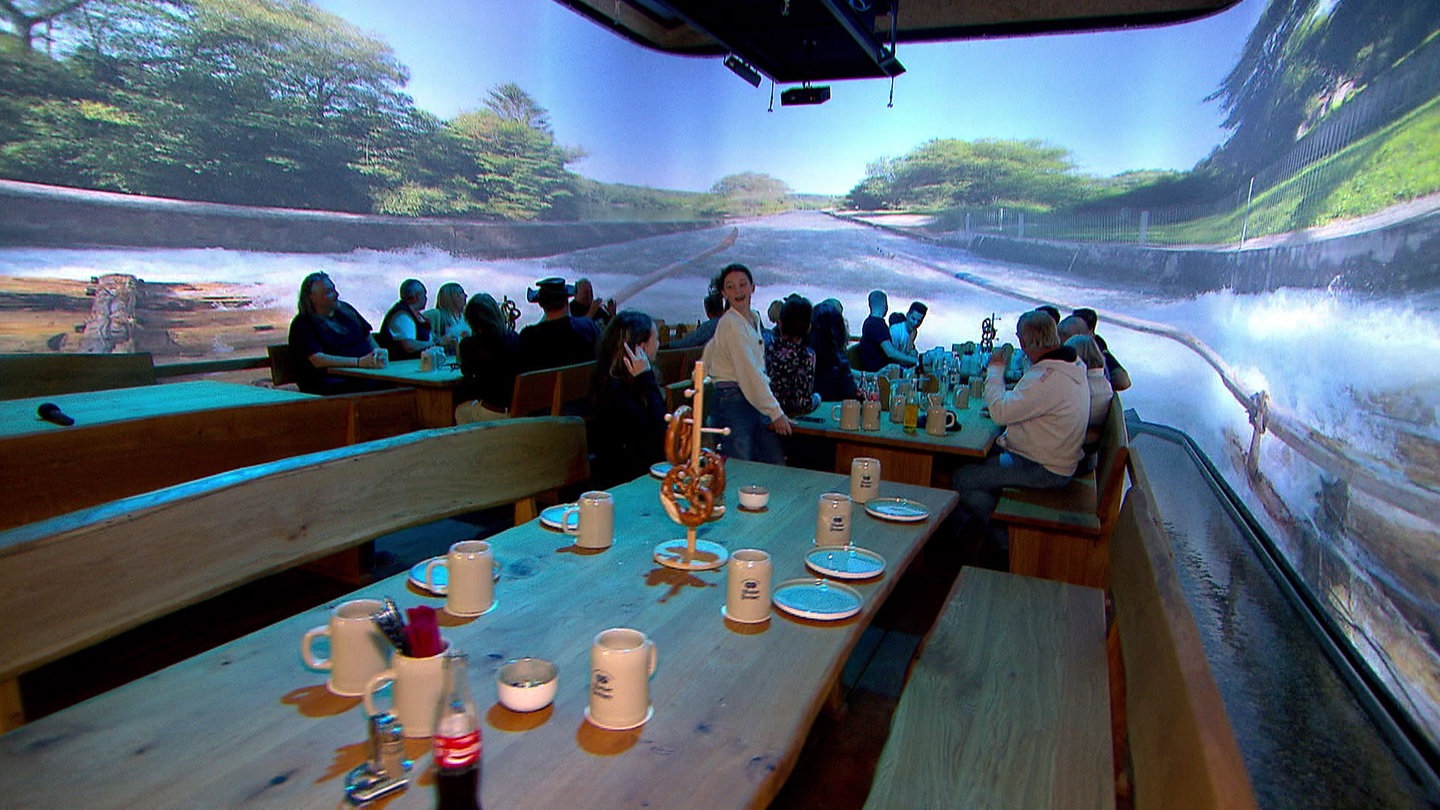 In Langenau kann man ganz zünftig eine Indoor-Floßfahrt mit Brezeln und Bier unternehmen. Große Leinwände erschaffen bei dem 5D-Event die Illusion, auf einem Wildwasser-Fluss unterwegs zu sein.