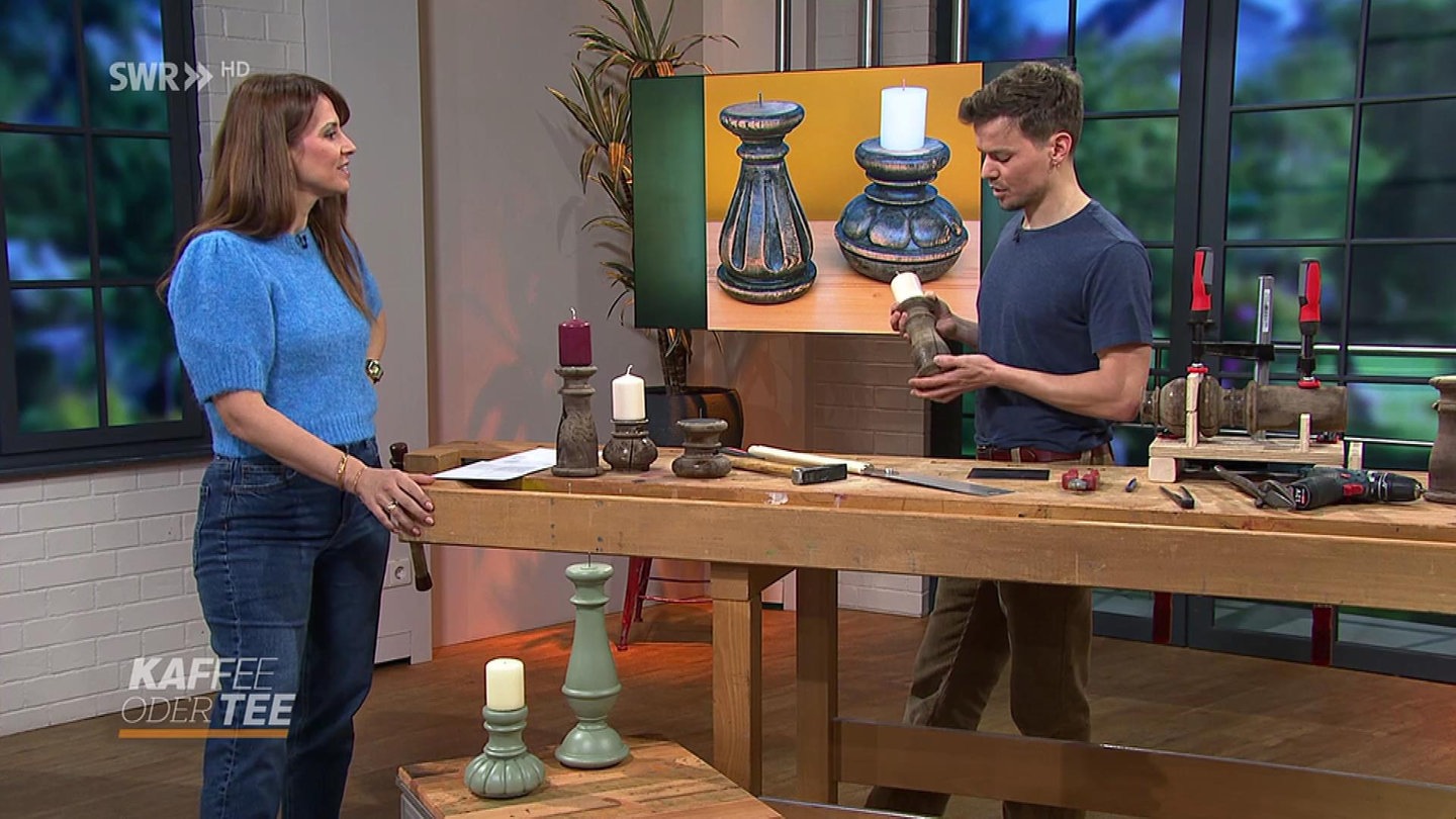1. Als erstes festlegen, wo das Tischbein auseinander gesägt wird. Dabei darauf achten, dass der Teil, der den Fuß bildet, möglichst dick ist, damit der Kerzenhalter gut und stabil steht. Sind die Holzbeine sehr dünn, kann auch aus einem Altholzbrett eine runde Scheibe ausgeschnitten werden. Diese wird dann als Fußplatte mit dem Kerzenhalter verschraubt.