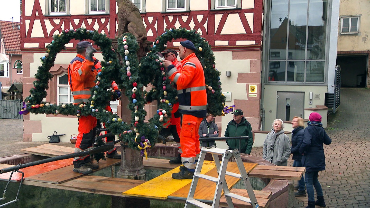 In Külsheim gibt es nicht nur einen Brunnen, der für Ostern geschmückt wird. Gleich 18 Stück werden von den Bewohnern in Szene gesetzt. Die Osterdeko ist maßgeschneidert.