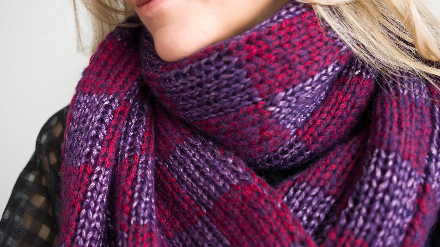 Das Modell spielt mit unterschiedlichen Garnstrukturen: Es wird dafür ein glattes, glänzendes Garn mit einem flauschig-weichen Material kombiniert. Die Farbgebung ist dabei dezent, Ton-in-Ton gehalten. Für das grafische Doppelstrick-Muster, welches auf beiden Seiten gleich erscheint, können natürlich auch Farben mit mehr Farbkontrast ausgewählt werden – lediglich das Garnvolumen sollte in etwa gleich sein. Durch die speziell Strick-Technik und die doppelten Lagen entsteht ein besonders wärmender Schal!
