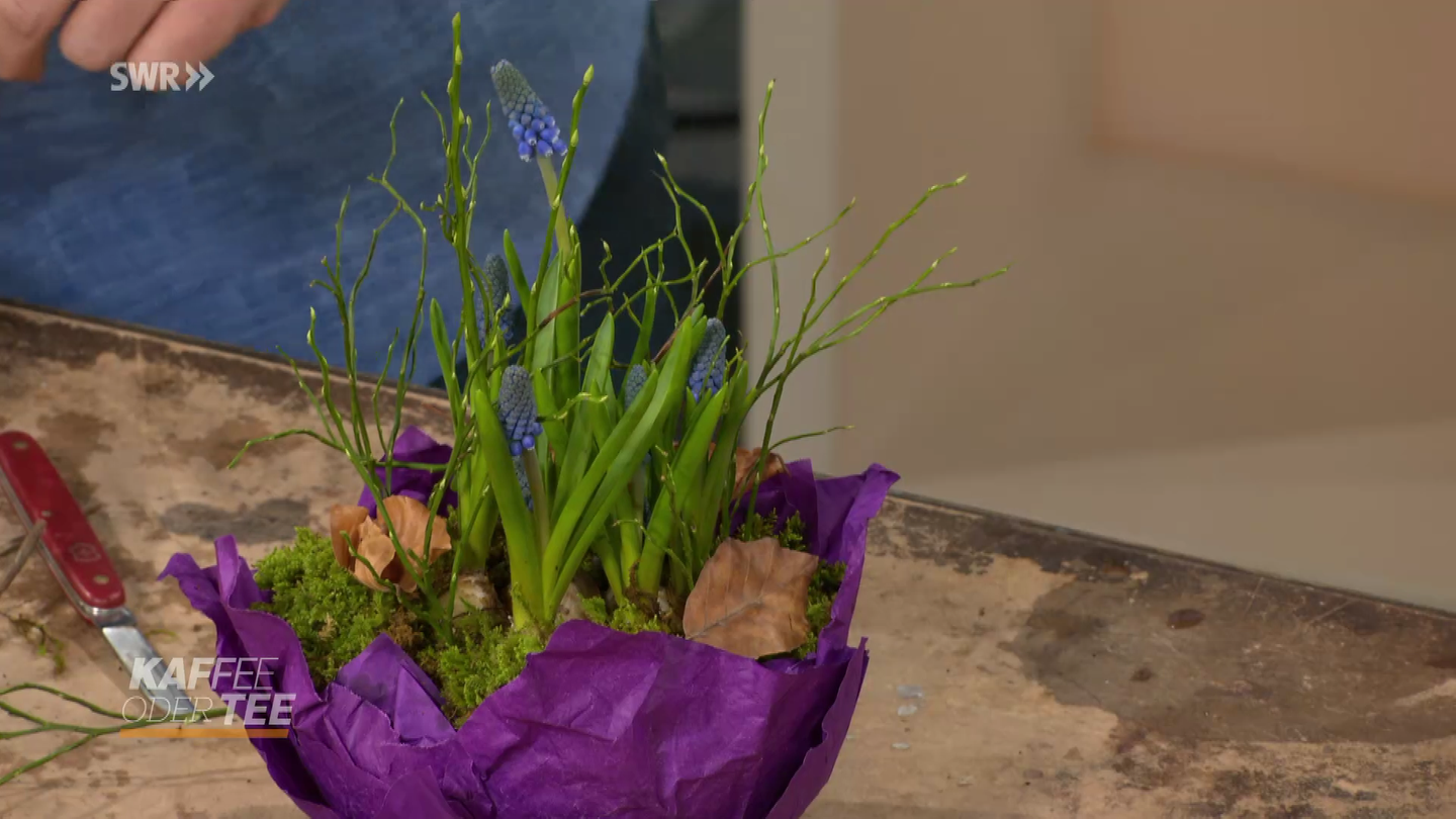 5. Die Wurzeln der Traubenhyazinthen leicht anfeuchten, mit Moos großzügig umwickeln und in die Schale setzen. Alles mit Zweigen ausdekorieren.