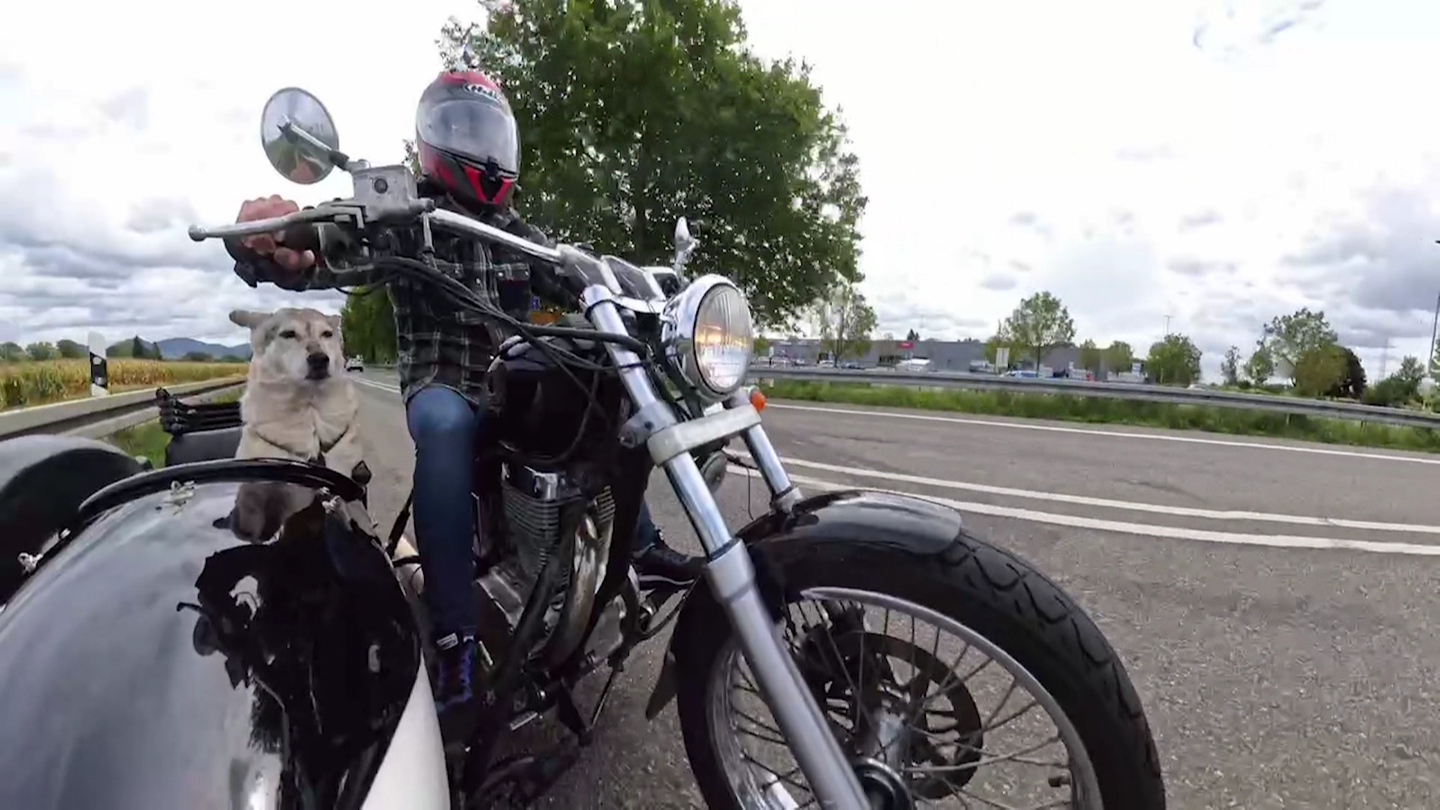 Feline und ihr Hund Momo verbringen die Freizeit am liebsten auf der Straße. Aber nicht mit Gassigehen, sondern im Motorradgespann. Wenn sie mit 80 km/h über die Landstraße düsen, sind sowohl Frauchen als auch der ehemaligen Straßenhund glücklich.