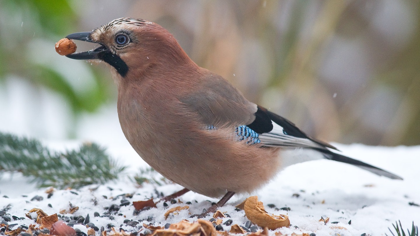Vögel, die außerhalb unserer Wohngebiete überwintern, müssen im Winter selbst genug zu fressen finden. Viele greifen da auf Nüsse und Samen zurück. Der Eichelhäher geht auf Nummer sicher und legt sich im Wald Reserven an. Deshalb gilt der Vogel wegen seiner Vorratshaltung auch als fliegendes Eichhörnchen.