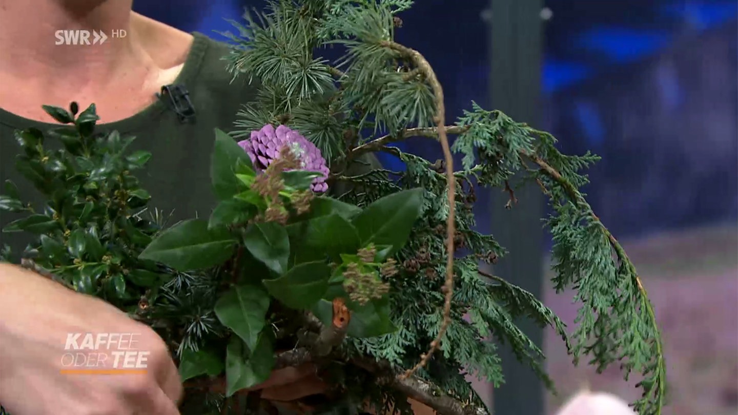 Ein schöner Hingucker auf jedem Tisch ist dieser weihnachtliche Strauß mit bunten Zapfen. Neben Kiefernzweigen gehören auch noch Wacholder, Konifere und Eukalyptus hinein!