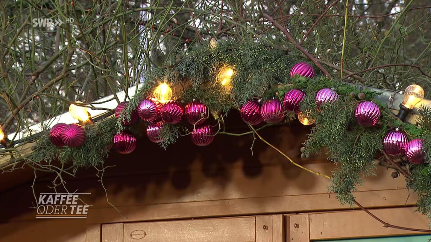 2. Die Koniferen-Zweige in kleine Stücke schneiden und mit dem grünen Draht oben am Ring fixieren.