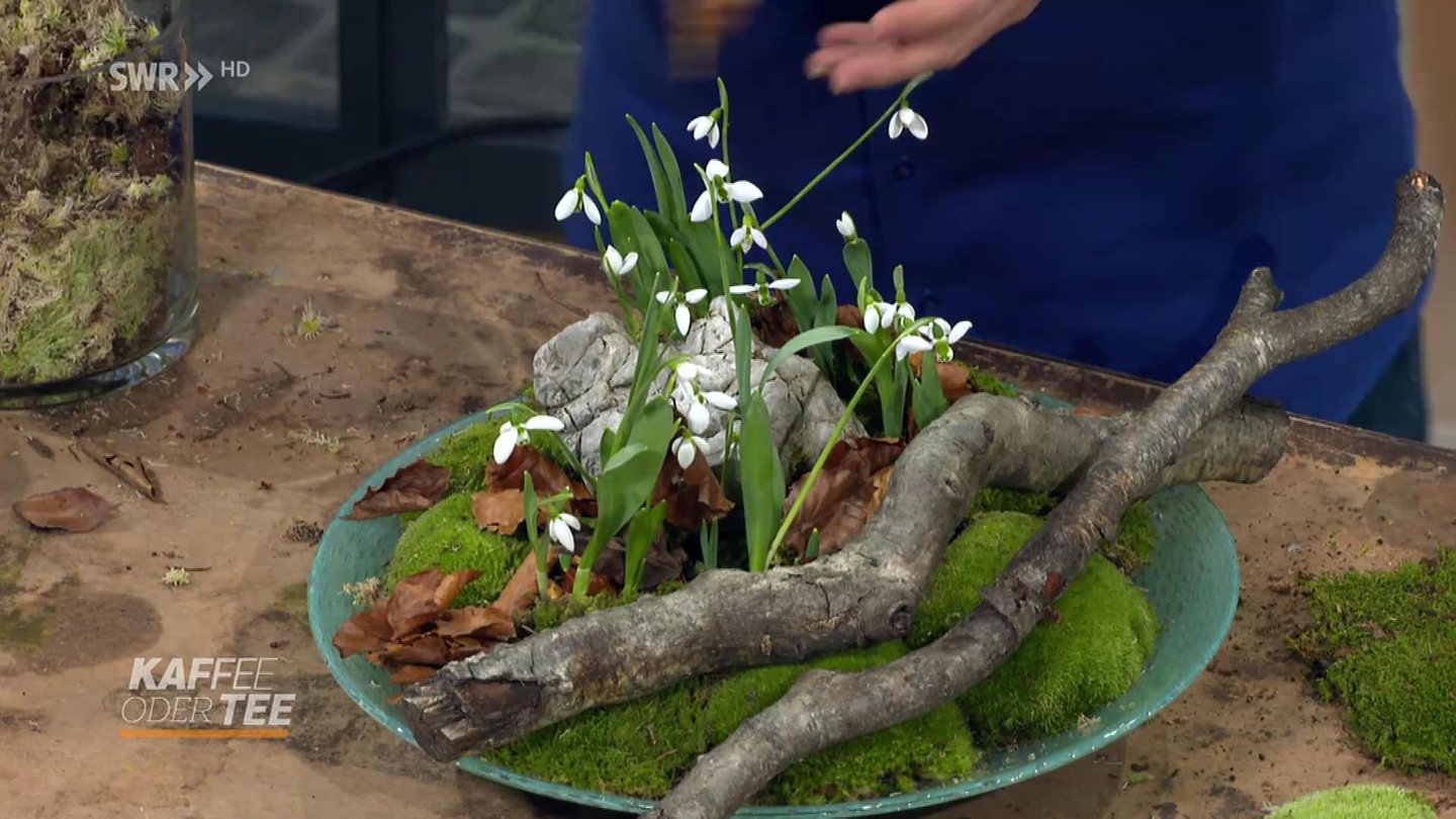 Green DIY Winterliche Dekoration mit Schneeglöckchen, Moos, Holz und Ästen
