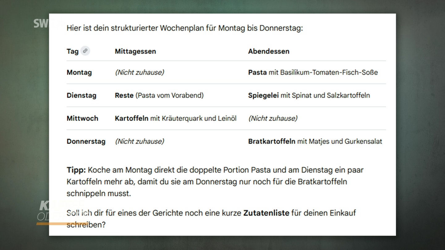 Natürlich kann die KI uns einen Teil der Arbeit abnehmen und die Essensplanung so noch schneller machen. Geben Sie in die KI-Suchfunktion ein, was Sie essen möchten, und teilen Sie mit, wann Sie nicht zuhause sind. Die KI erstellt dann eine Tabelle.