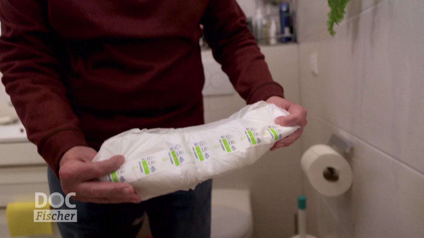Vor zwei Jahren wurde bei Gerd Baum Prostatakrebs festgestellt. Die Prostata wurde vollständig entfernt, auch umliegendes Gewebe und der Schließmuskel mussten entnommen werden. Die Einlagen gehören seither zum Alltag von Gerd Baum. Er muss die Situation akzeptieren. Je nachdem wie er sich belastet, was er isst und trinkt, braucht er jeden Tag etwa drei davon.