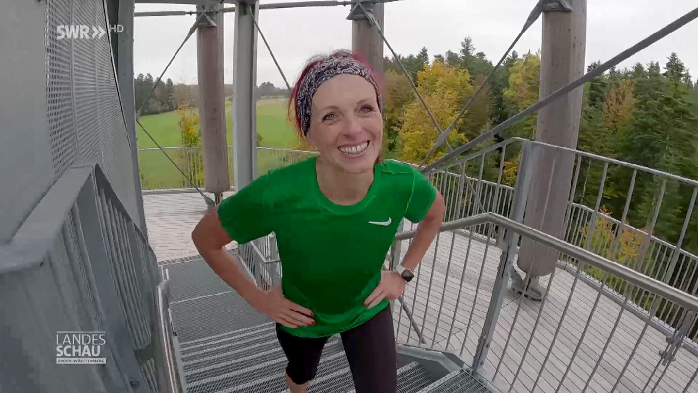 Extremsportlerin Tanja Höschele hat einen Weltrekord am Aussichtsturm "Himmelsglück" in Schömberg aufgestellt. Auch Krämpfe konnten sie nicht von ihrem Ziel abhalten.