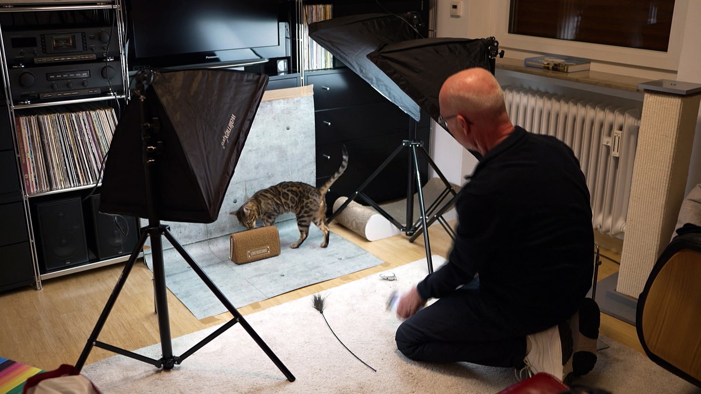 Harald Fuchs setzt seine Taschen und Rucksäcke mit Katzen in Szene. Der 60-Jährige betreibt ein Lederwarengeschäft in Göppingen. Bei einem Seminar zu Social-Media-Vermarktung kam ihm die zündende Idee, die Tiere als Models einzusetzen, denn Katzen liebt er schon sein Leben lang.