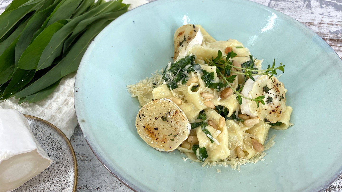 16. Pasta und Ziegenkäse auf Tellern anrichten, die Pinienkerne überstreuen und alles servieren.
