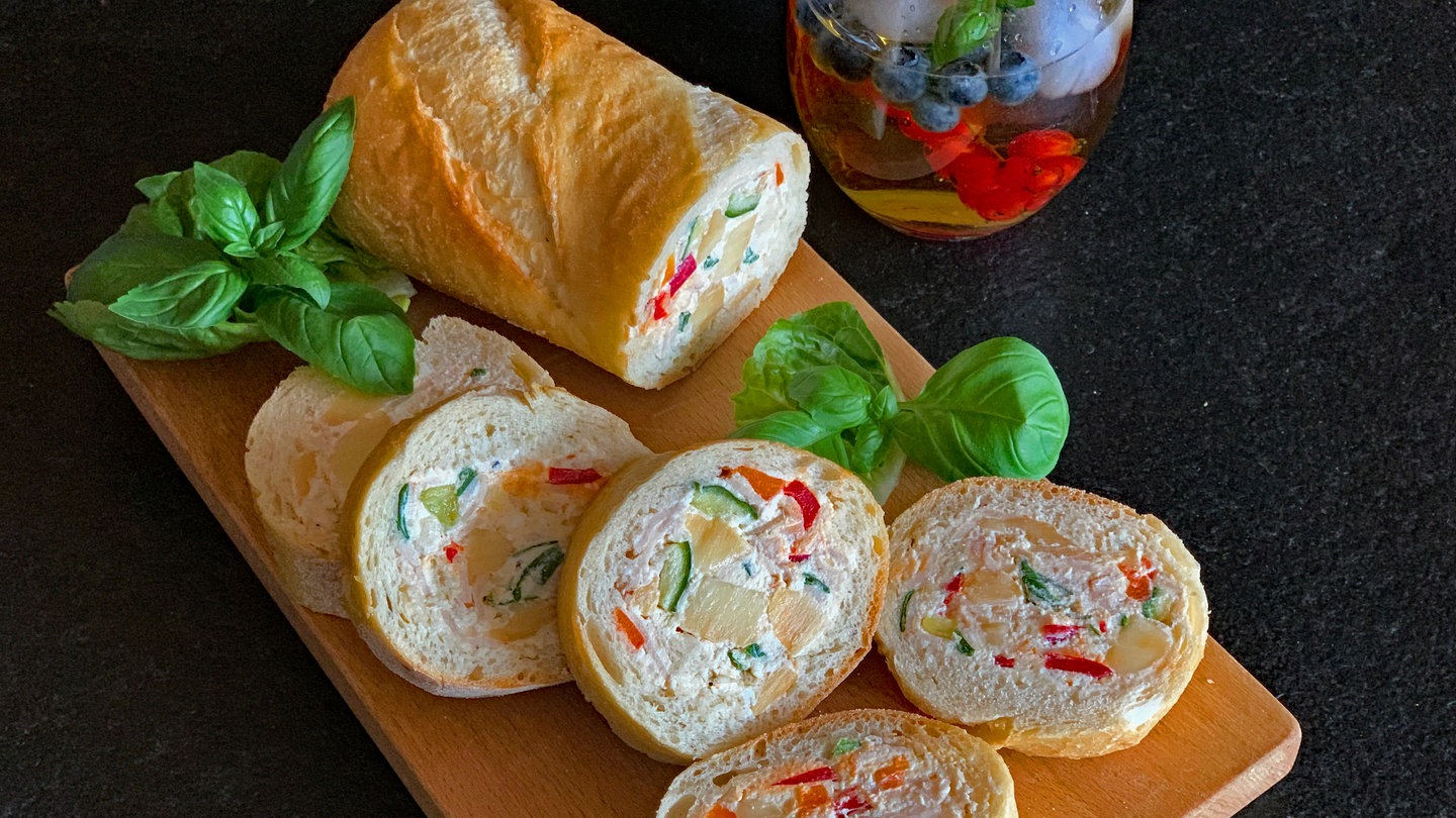 Dann gebt ihr die Füllung in die ausgehöhlten Baguettebrötchen oder das Baguette und drückt sie fest. Dann das gefüllte Brot stramm in eine Plastikfolie einwickeln und eine Stunde im Kühlschrank kühlen.