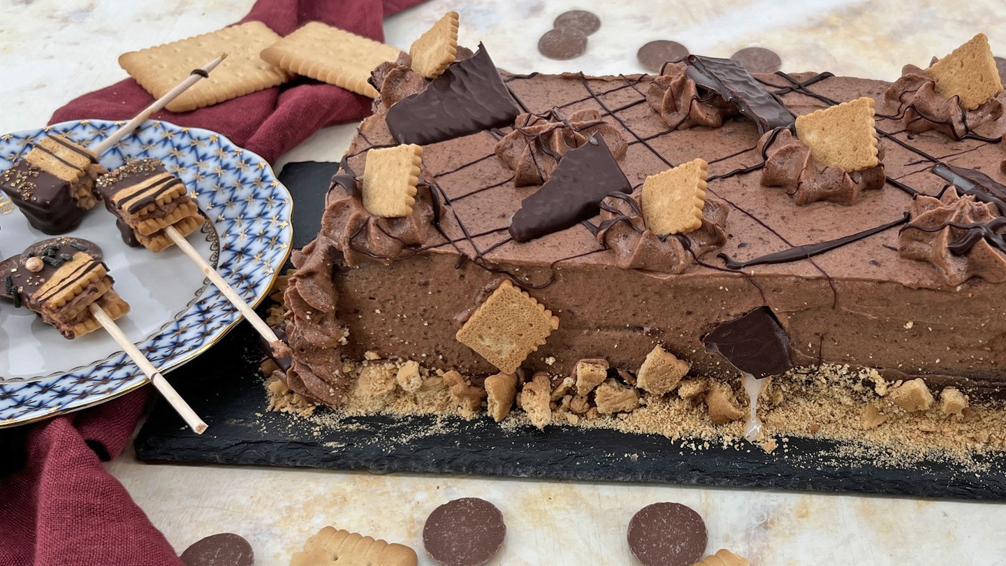 5. Weiter schichten, bis Schokomasse und Kekse verbraucht sind, dabei mit einer Schicht Butterkeksen abschließen.