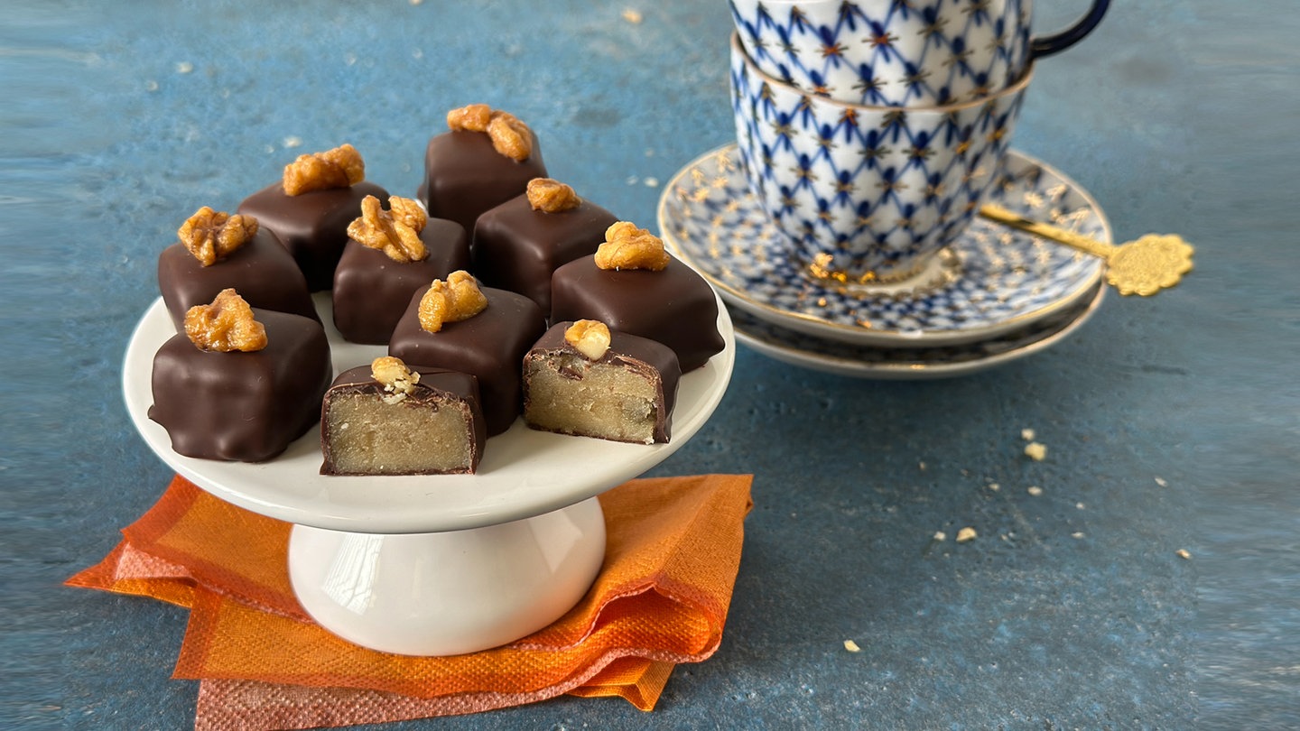 9. Bevor die Schokolade ganz angezogen ist, je eine karamellisierte Walnusskernhälfte auf einer Praline leicht andrücken und trocknen lassen.