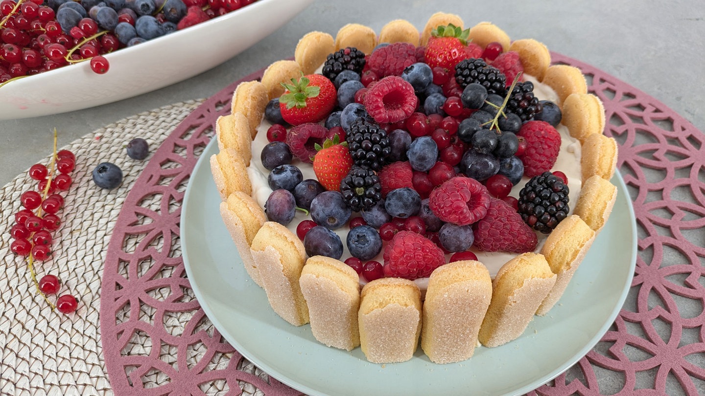 Eine Beeren-Charlotte ist eine klassische französische Desserttorte, die aus Löffelbiskuits und einer cremigen Füllung aus Quark, Frischkäse, Sahne und Gelatine besteht, die mit frischen Beeren vermischt wird.