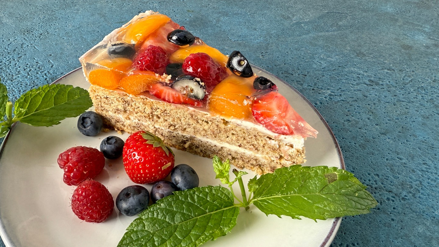 16. Den Walnussboden abwechselnd mit Beeren und Aprikosen belegen.