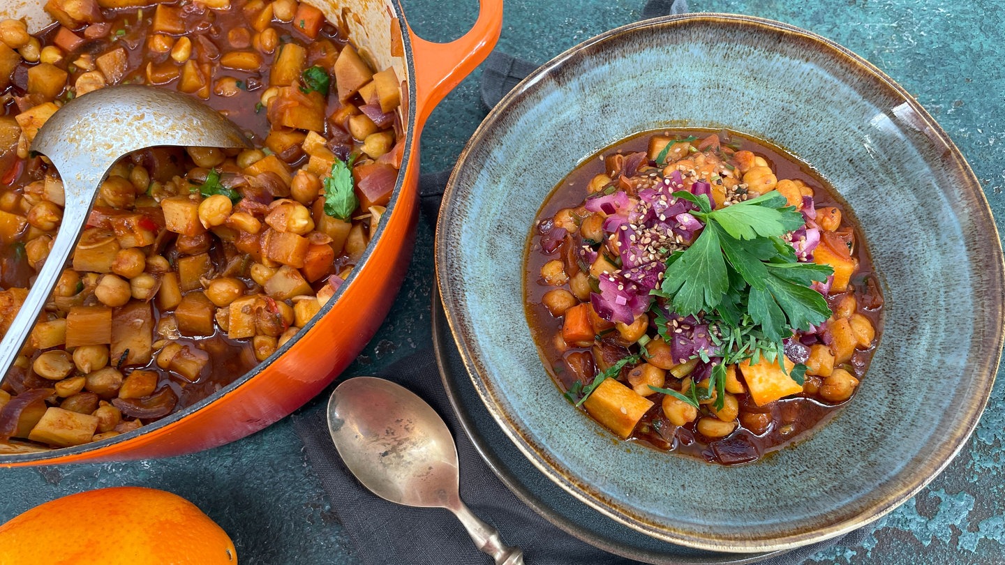 13. Petersilie waschen, trocken schütteln, abzupfen und die Blätter hacken. Vor dem Servieren Petersilie und Sesam über den Eintopf streuen und alles anrichten.