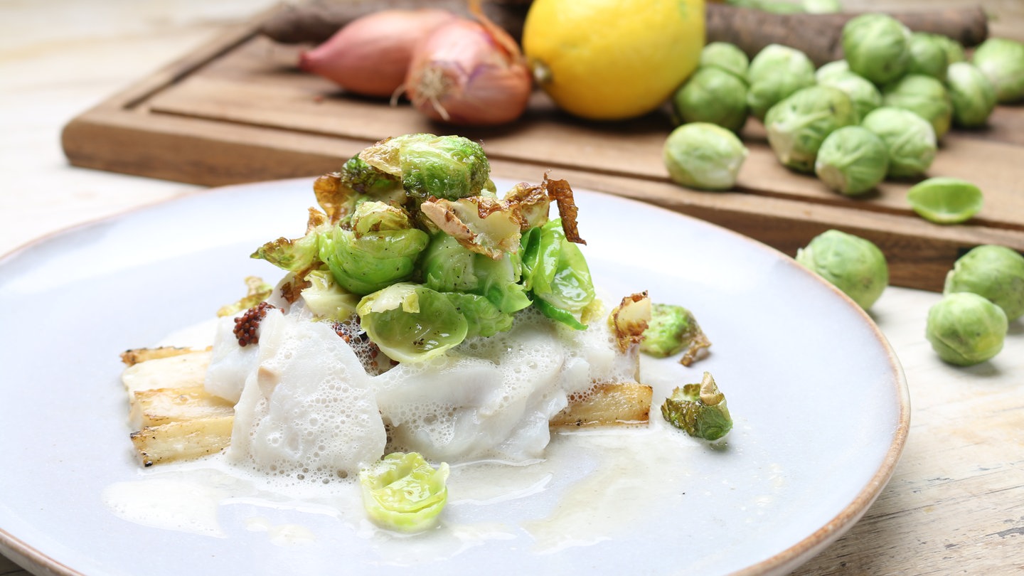 Geschnetzeltes vom Fisch - das ist die feine Küche. Ganz vorsichtig wird der in feine Scheiben geschnittene Kabeljau im Backofen gegart, denn in der Pfanne würde der zarte Fisch einfach zerfallen. Dazu gibt es eine Beilage von Rosenkohlblättern, teils mariniert, teils frittiert.