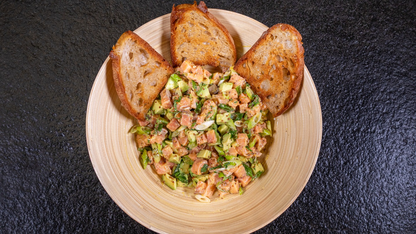 Lachstatar mit Avocado und geröstetem Brot zubereiten