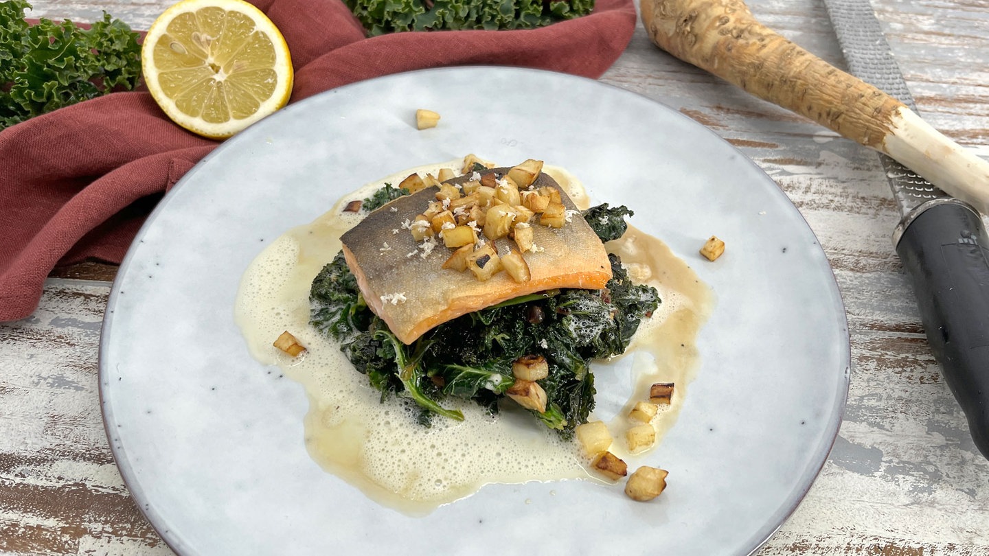 Rezept von Tarik Rose Gebratener Saibling mit Meerrettichschaum und Grünkohl