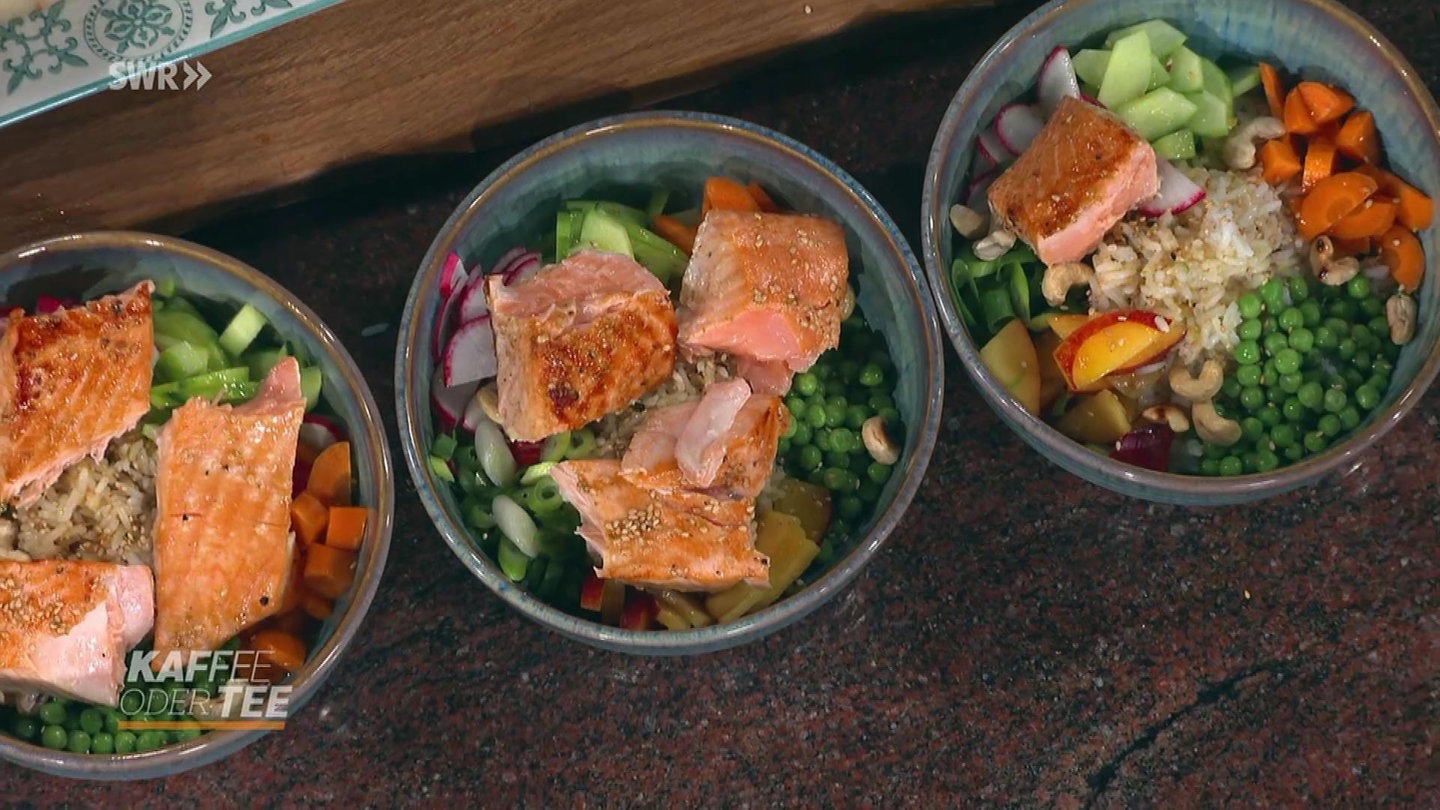 8. Reis abtropfen lassen. Reis, Lachs, Cashewkerne und Sesam auf die Bowls verteilen. Mit Marinade beträufeln und servieren.