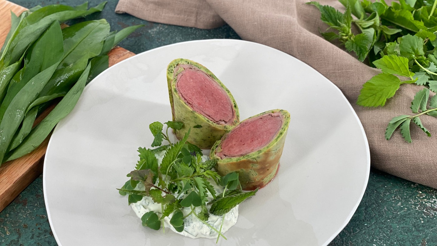 Tipp: Bei dieser Zubereitung ist ein Kerntemperaturmesser sehr wichtig, um ein perfektes Ergebnis zu erzielen. Der Rehrücken im Waldkräuterflädle sollte bis zu einer Kerntemperatur von 56 Grad gegart werden um maximal zart und saftig zu sein.