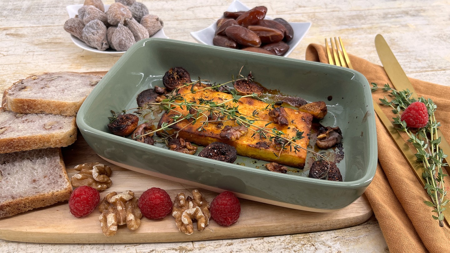 3. Feigen abbrausen, trocknen und vierteln. Feigenviertel zum Käse in die Form geben.