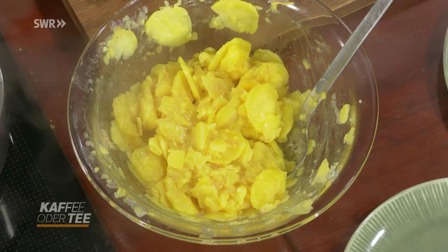4. Kartoffeln abgießen, etwas abkühlen lassen, abziehen und in Scheiben schneiden. Kartoffelscheiben in eine Schüssel geben, noch heiß mit der Brühemischung übergießen und alles vorsichtig durchmischen. Kräftig mit Salz und Pfeffer würzen. Marinierte Kartoffeln unter gelegentlichem Rühren lauwarm abkühlen lassen.