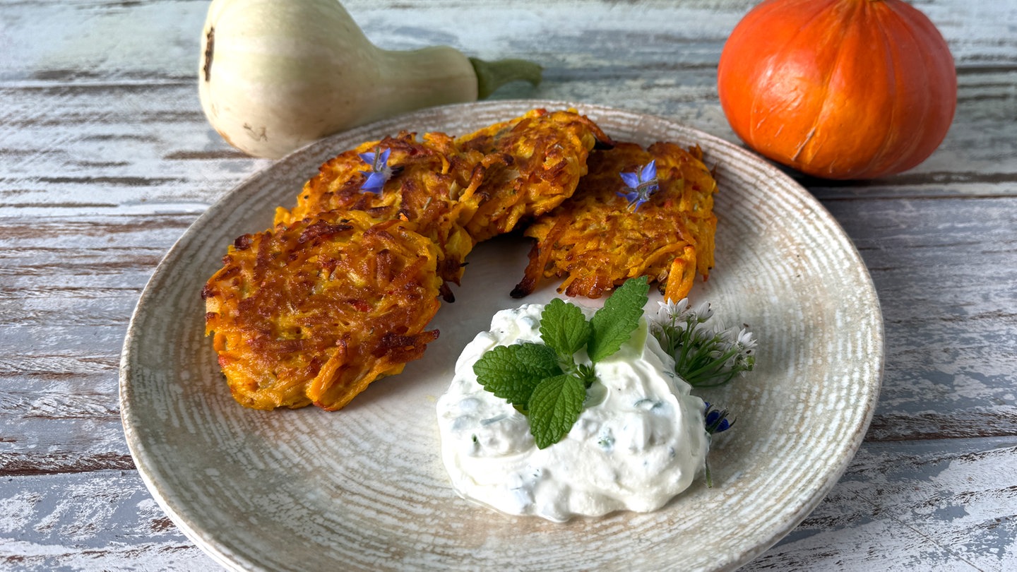 7. Die Kürbispuffer mit dem Schnittlauchdip servieren