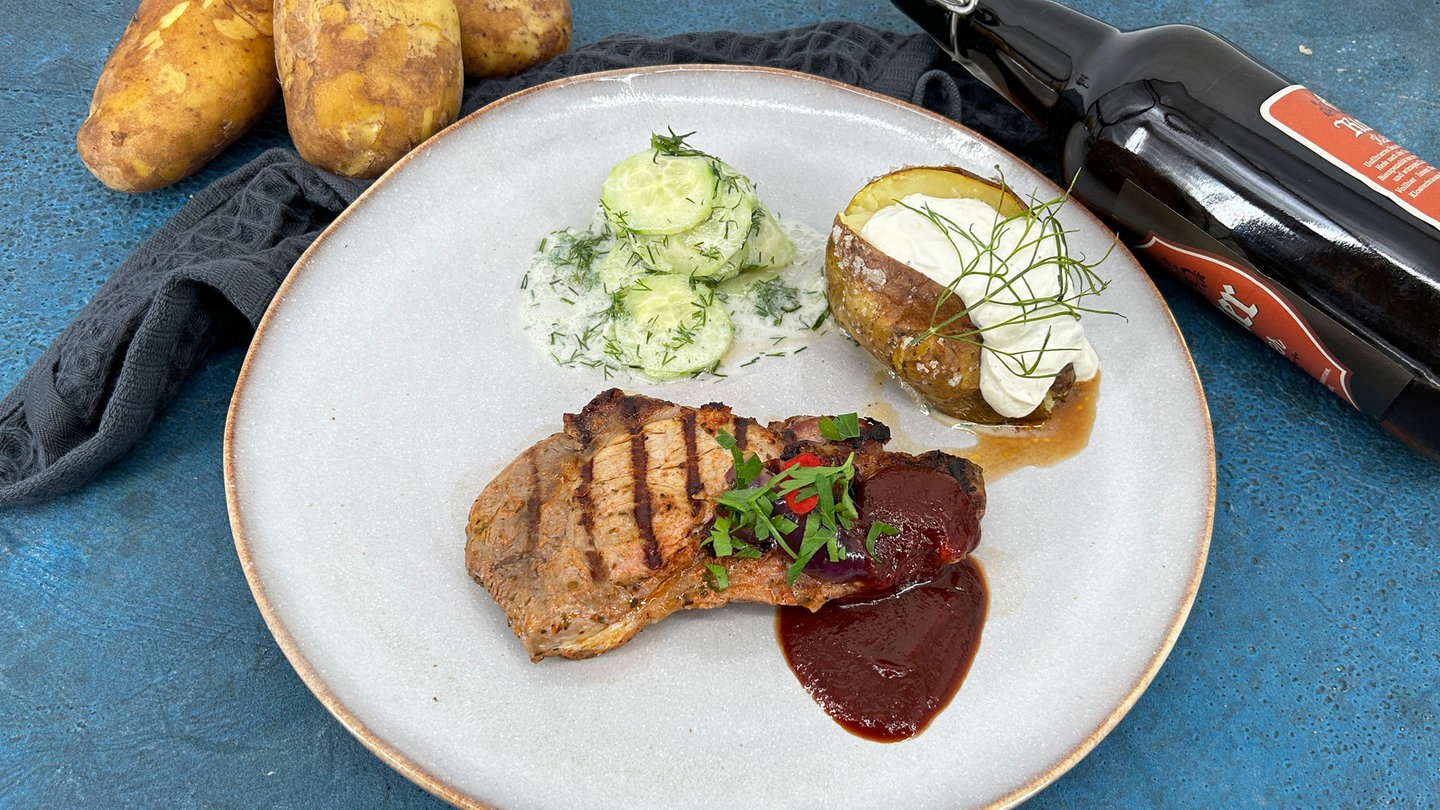 17. Gebratene Steaks auf Teller geben, dazu BBQ-Sauce, Ofenkartoffeln, Sour Creme und Gurkensalat reichen.