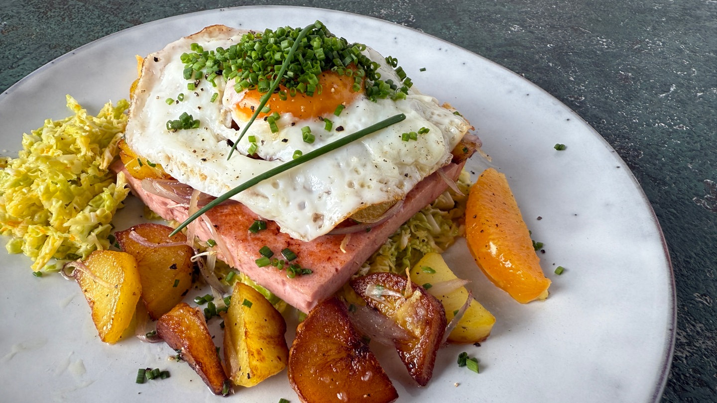 Martin Gehrlein brät Fleischkäse und zeigt nebenbei, wie die perfekten Bratkartoffeln und Spiegeleier gelingen. Dazu gibt es einen frisch-fruchtigen Wirsingsalat mit Orangen.