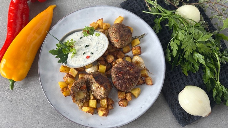 Eberhard Braun brät Frikadellen, die mit Paprikastückchen und Käse gefüllt werden. Dazu gibt es Rosmarinkartoffeln und einen würzigen Kräuterquark.