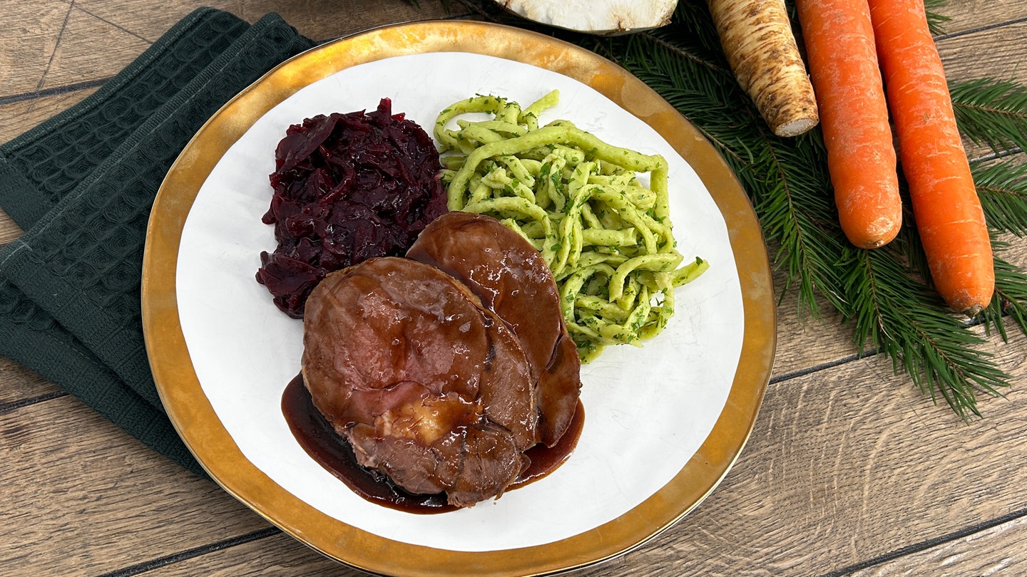 Timo Böckle bereitet das Hauptgericht für das diesjährige Weihnachtsmenü zu. Er serviert einen Rehbraten mit viel Soße, würzigen Kräuterspätzle und karamellisiertem Rotkraut.