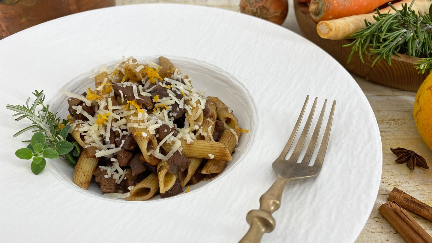 13. Zimtstange, Sternanis und Lorbeerblatt entfernen und das Ragout mit Salz und Pfeffer abschmecken.
